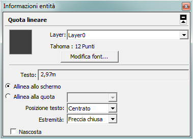 In questa finestra si potrà cambiare la cifra della quota, lo stile del testo, la sua posizione (inizio esterno , centro o fine esterna), si potrà anche allineare la quota al modello o allo schermo oltre che cambiare le estremità (slash, punto,freccia chiusa, freccia aperta o nessuna estremità).